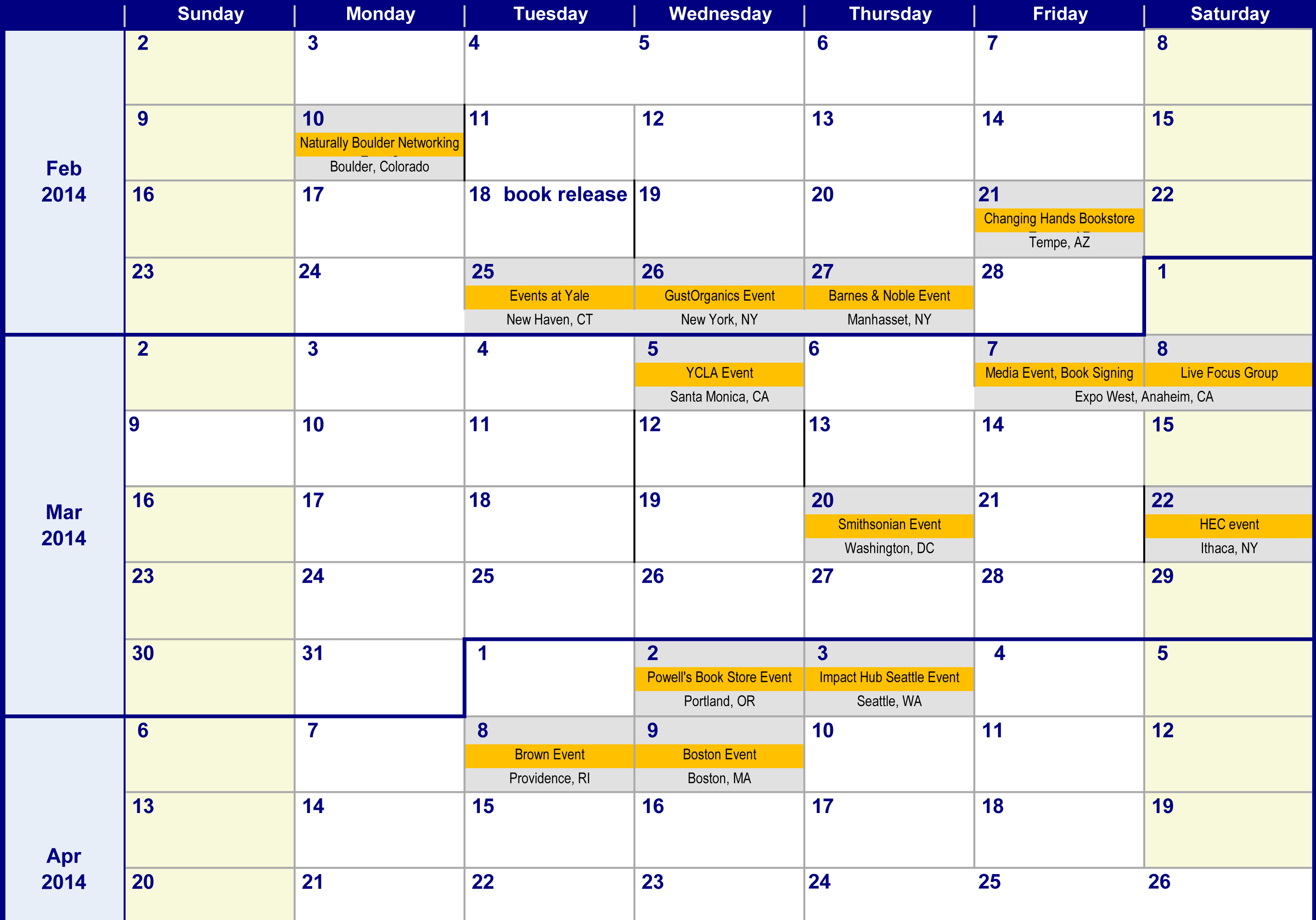 • March 7: booksigning at Expo West in Anaheim, CA; 2:45 – 3:45pm, Marriott Platinum Ballroom 4
